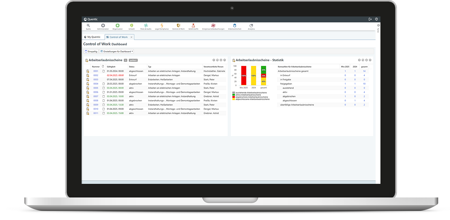 Mit Quentic Arbeitssicherheit erstellen Sie komplette Gefährdungsbeurteilungen für betriebliche Tätigkeiten und Arbeitsmittel. An diese können Ihre Control-of-Work-Prozesse direkt anknüpfen.